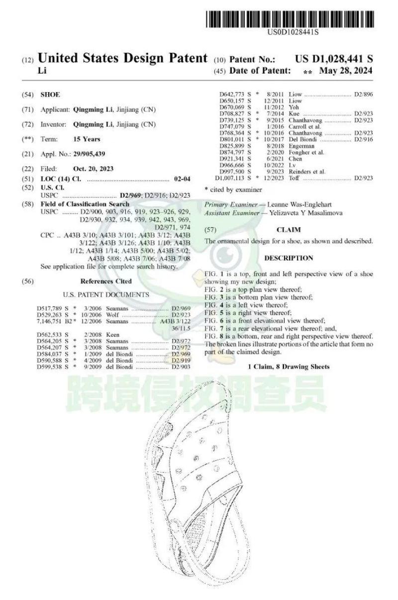 洞洞鞋外觀專利信息 圖源:跨境侵權調查員