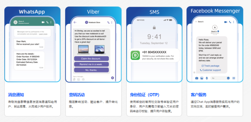 能夠集成阿里云國際短信、WhatsApp、Viber、Facebook Messenger、Instagram Messaging多個消息通道,實現統一管理。企業無需自己調用各個渠道的API,就能實現跨平臺的圖文、語音、視頻等類型消息發送,大大簡化了企業的操作流程,使企業能更專注于內容和策略的制定。