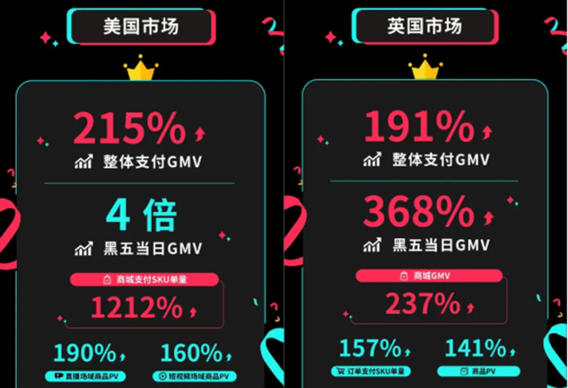 就以去年旺季大促為例,官方數據顯示,2023年黑五期間,TikTok Shop美區整體支付GMV環比增長超過215%,黑五當日GMV環比實現4倍增長。同時,TikTok英區也是收獲滿滿,整體支付GMV環比增長達到191%。