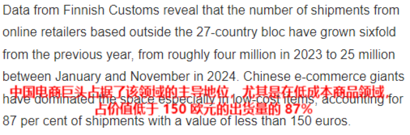 這其中,中國電商平臺占據(jù)主導(dǎo)位置,尤其是在價值低于150歐元的小商品領(lǐng)域,中國電商平臺的出貨量占比達到87%。