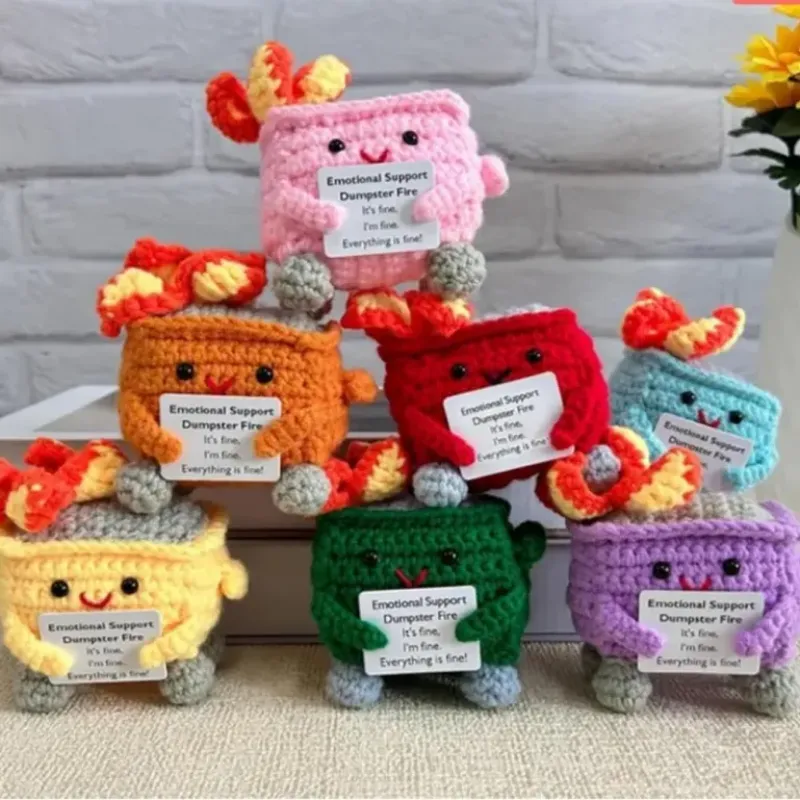 單看這款玩具其實并沒有什么特別之處,小巧的鉤針毛絨垃圾箱造型,不過其搭配“沒事,我很好,一切都很好”的情緒標語,用一種幽默詼諧的方式傳達當代人的情緒心境,它可以掛在鑰匙扣上當裝飾品,也可以當成書桌擺件。