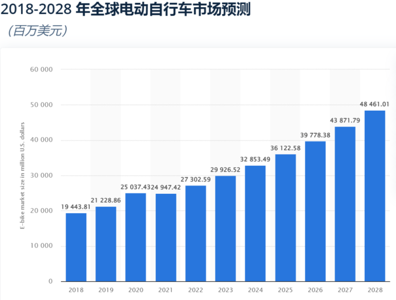 站在風(fēng)口上才能飛得更高更遠(yuǎn),Rockbros的騰飛少不了市場(chǎng)的托舉。近年來,戶外運(yùn)動(dòng)在全球范圍內(nèi)掀起了一股熱潮,E-bike作為最具代表性的短途出行工具迅速得到了普及,吸引了無數(shù)品牌紛紛入局。來自Statista發(fā)布的數(shù)據(jù)顯示,E-Bike市場(chǎng)有望從2020年的250億美元增至2028年的485億美元。在電動(dòng)出行的普及和騎行文化興起的背景之下,騎行配件市場(chǎng)也迎來大好發(fā)展機(jī)遇。