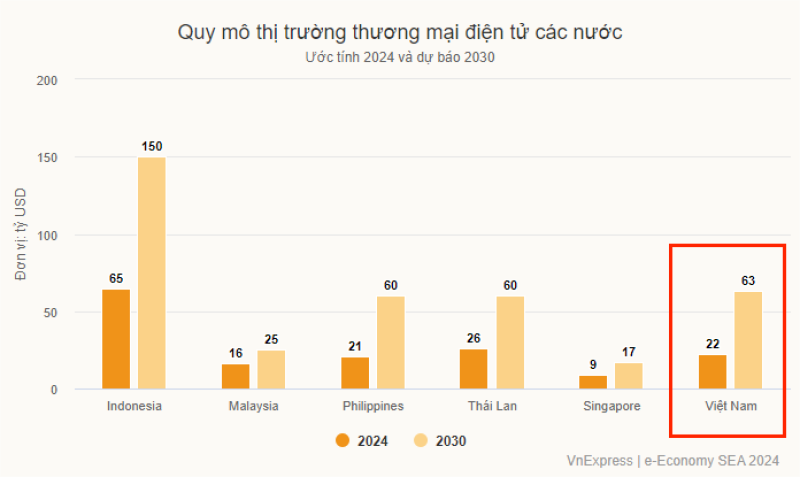 根據谷歌聯合貝恩公司發布的《2024年東南亞電子經濟》報告,在東南亞地區,越南的電商規模僅次于印度尼西亞和泰國,預計今年將達到220億美元,在同比增速方面,越南電商也能排進前三。