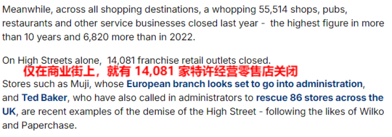 根據Local Data Company的數據,2023年,英國有超過14000家零售店關門。即便是曾經深受名人和英國王室喜愛的時尚品牌Ted Baker,今年也宣布進入破產程序,所有英國門店陸續關閉。