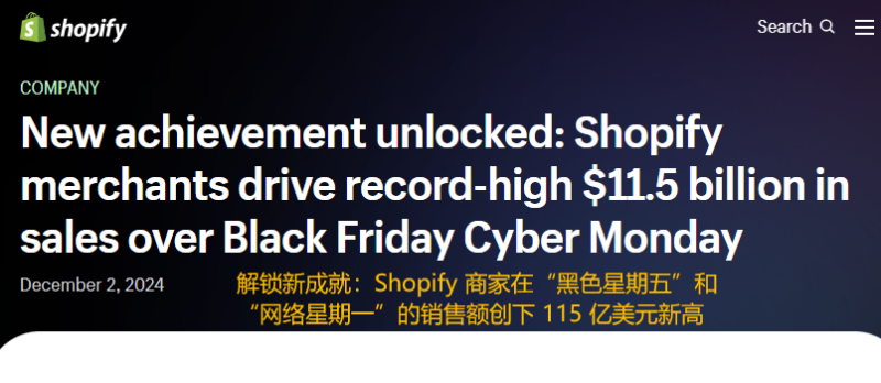 根據Shopify公布的銷售數據,今年黑五網一期間,平臺賣家銷售額創(chuàng)下115億美元的新紀錄,比去年增長了24%,全球共有7600多萬客戶通過Shopify購買商品。
