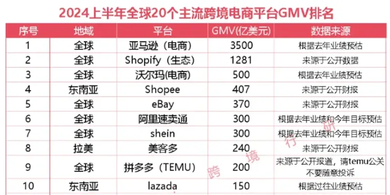 2024上半年主流跨境電商平臺GMV排名 圖源:跨境行研公眾號
