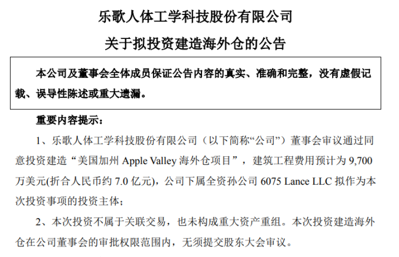 最近,樂歌股份發(fā)布公告,將斥資9700萬美元(約合7億人民幣),在美國加州新建海外倉“Apple Valley”,預(yù)計(jì)倉庫占地面積將達(dá)到120萬平方英尺(大約11萬平方米),公司全資子公司6075 Lance LLC將作為本次投資事項(xiàng)的投資主體。