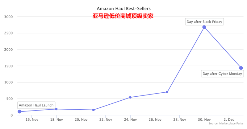 根據電商數據監測機構Marketplace Pulse的統計,今年黑五期間,amazon haul銷量直線上升,大批商品瘋狂爆單,在黑五第二天,達到峰值,暢銷商品數量接近2700件。商城里的“銷冠”賣家數量也是一路飆升。