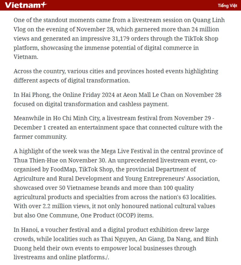 11月30日,承天順化省舉行的大型直播節展示了越南全國63個地方的50多個越南品牌和100多種優質農產品,該直播由 FoodMap、TikTok Shop、該省農業和農村發展部以及青年企業家協會聯合舉辦,活動觀看次數超過220萬次,進一步促進了地方文化和優質農產品的推廣。在河內,優惠券節和數字產品展覽吸引了大批人群,而太原、安江、峴港和平陽等地方也舉辦了自己的活動,通過直播和在線平臺支持當地企業。