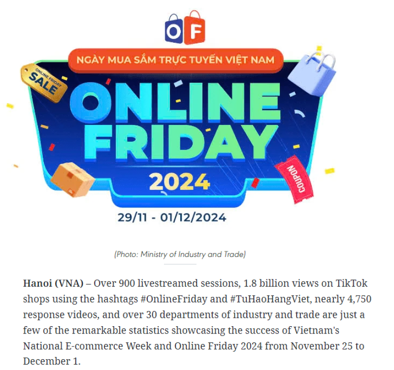 2024年“線上星期五”由越南工業和貿易部下屬的電子商務和數字經濟局主辦,活動得到了物流公司、數字基礎設施、網絡紅人以及TikTok Shop平臺的全力支持。其中,11月28日Quang Linh Vlog的直播成為一大亮點,觀看超過2400萬次,憑借TikTok Shop平臺的強大支持,該直播成功促成了31,179份訂單。與此同時,越南全國各地也舉辦了各類主題活動,進一步促進了消費者與商家之間的互動。
