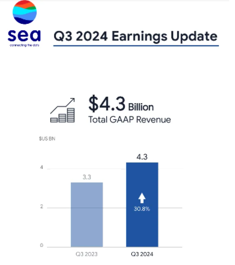 但今年開始,Sea的業務出現反彈。公司最新公布的第三季度業績顯示,Sea?Ltd每股收益達到24美分,相比去年同期的每股虧損26美分有了顯著改善;總營收為43.3億美元,同比增長31%,實現了自2022年第一季度以來最快的增長。