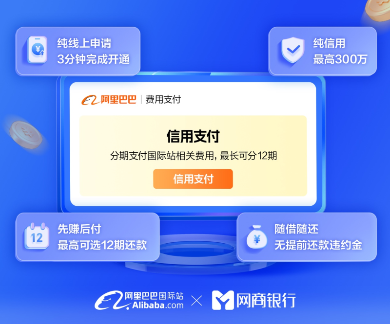 12月10日消息,為破解跨境商家“融資難”,助力商家生意增長,阿里巴巴國際站聯合網商銀行為商家推出“信用支付”解決方案。“信用支付”是阿里巴巴國際站為幫助跨境商家緩解資金壓力,與網商銀行聯合定制的純信用金融產品,為企業個人(法定代表人)提供經營性信用貸,無需企業擔保。自今年9月正式上線以來,阿里巴巴國際站平臺上使用“信用支付”的跨境商家數量已增長4倍。