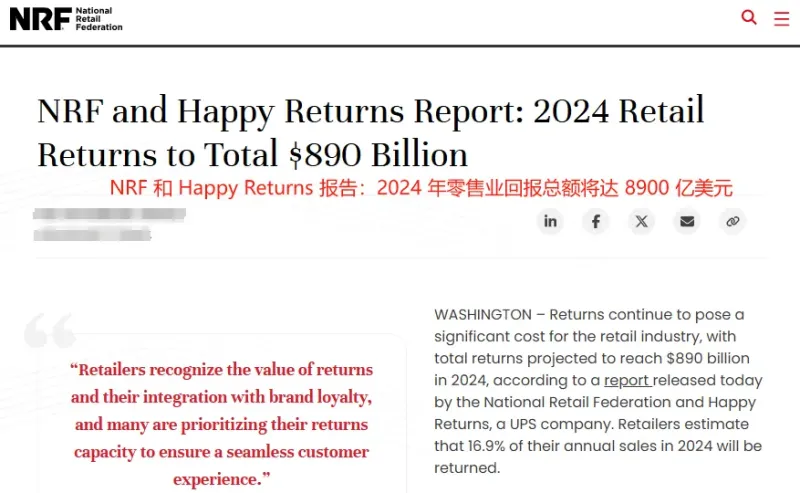 根據(jù)美國零售聯(lián)合會(NRF)和退貨管理公司Happy Returns發(fā)布的報告,隨著消費者準備在本月接收并退回大量旺季電商訂單,退貨將繼續(xù)給美國零售業(yè)帶來巨大成本。預(yù)計2024年退貨將占所有商品銷售額的16.9%,退貨總額達到8900億美元(約合人民幣5.5萬億元)。