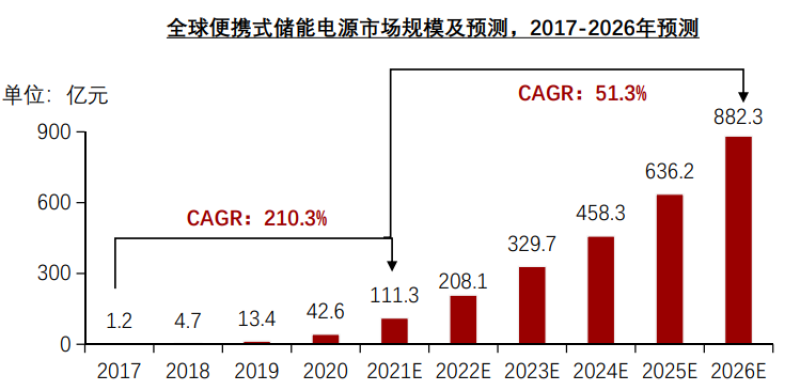 根據中研產業院的預測數據,2020年全球家庭儲能市場規模為75億美元,到2027年,這一數字有望上升至264億美元。中國化學與物理電源行業協會預測,到2026年,全球便攜式儲能市場規模將達到882.3億元,而2021年,這一規模僅為111.3億元。
