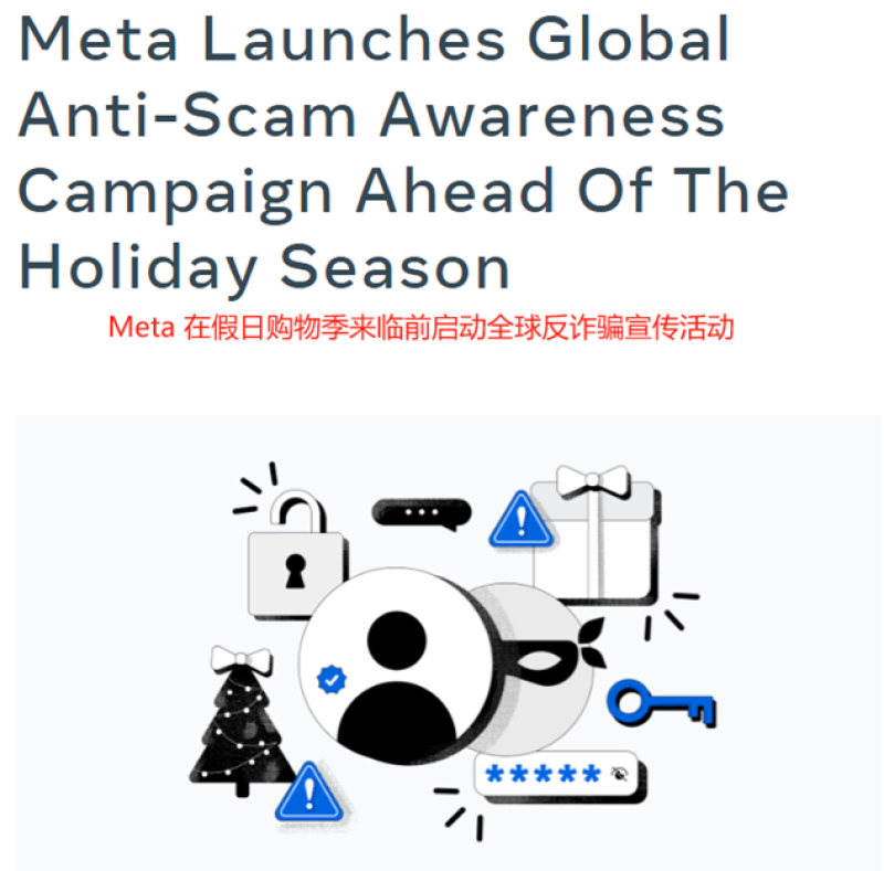 作為全球知名的互聯網科技巨頭,Meta早早就注意到了這一趨勢,為了幫助消費者在今年旺季免受欺詐,Meta決心與研究人員和安全專家合作,發起一項全球反詐騙意識運動,旨在提高人們在假日購物季期間對Facebook Marketplace、WhatsApp和Instagram平臺上欺詐行為的警覺性。