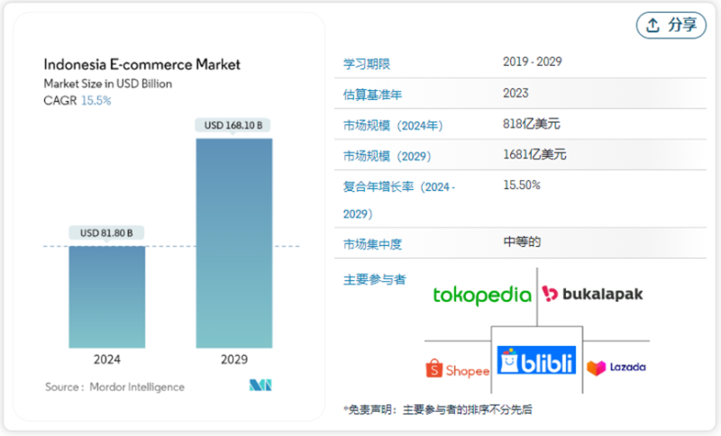 一份來自Mordor Intelligence的報告顯示,2024年,印尼電商市場的規模大約為818億美元。未來幾年,這一市場還會持續增長,預計復合年增長率(CAGR)為15.5%。到了2029年時,該市場的規模有望達到驚人的1681億美元。而根據Statista提供的數據,2029年印尼用戶數量預計將達到9910萬,電商用戶滲透率也將從2024年的23.9%增長到34.8%。