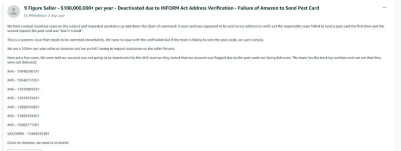 舉個(gè)例子,幾個(gè)月前,就有一位亞馬遜賣家發(fā)帖表示,由于《消費(fèi)者告知法案》的驗(yàn)證需要,亞馬遜向其寄了一張包含關(guān)鍵驗(yàn)證信息的明信片,但不幸的是,這張明信片在郵寄過(guò)程中意外丟失,賣家無(wú)法按時(shí)完成驗(yàn)證流程,導(dǎo)致賬號(hào)最終被封,損失巨大。