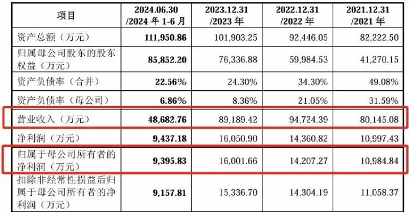 從財務狀況來看,技源集團整體呈上升趨勢。2021年至2023年,分別實現營收8.01億元、9.47億元、8.92億元。2024年上半年,營收為4.87億元;同期的凈利潤分別為1.1億元、1.42億元、1.6億元及0.94億元。