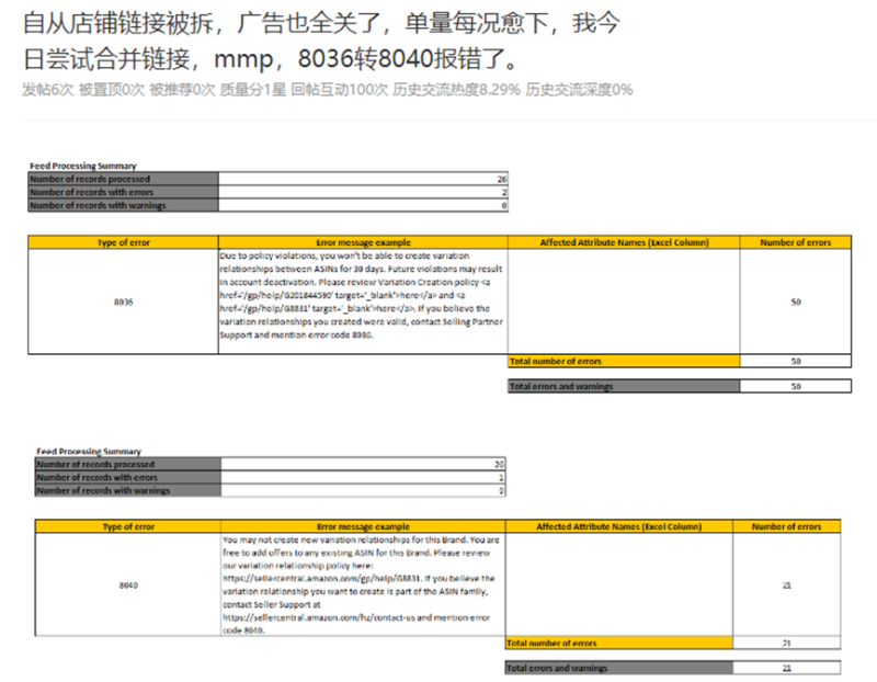 今年5月,違規(guī)變體掃號風(fēng)波結(jié)束不久后,有賣家發(fā)現(xiàn),在嘗試將店鋪鏈接合并時,亞馬遜后臺出現(xiàn)了大面積的8040報錯。運氣好的賣家,還是能成功合并變體,但有一部分運氣差的賣家遭遇此bug后就沒法將被拆分的變體合并起來了。有賣家對此無奈表示:“現(xiàn)在被強拆的變體都一動不動的躺著,不敢動啊!”