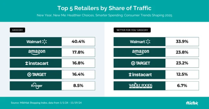 MikMak最新發(fā)布的購物指數(shù)顯示,在排名前五的在線雜貨零售商中,沃爾瑪以40.4%的流量份額遙遙領(lǐng)先,其次是亞馬遜(17.8%)、Instacart(16.8%)、Target(16.4%)及Kroger(8.5%)。在健康雜貨類別中,沃爾瑪仍占據(jù)第一(33.9%),不過與其他零售商的差距顯著縮小。