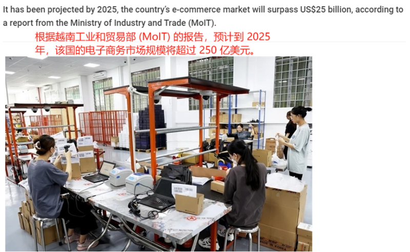 消息顯示,近日,越南工業(yè)和貿(mào)易部(MoIT)發(fā)布了一則有關(guān)越南電商市場(chǎng)的數(shù)據(jù)報(bào)告,經(jīng)該部門統(tǒng)計(jì),到2025年,越南電商市場(chǎng)規(guī)模將超過(guò)250億美元。
