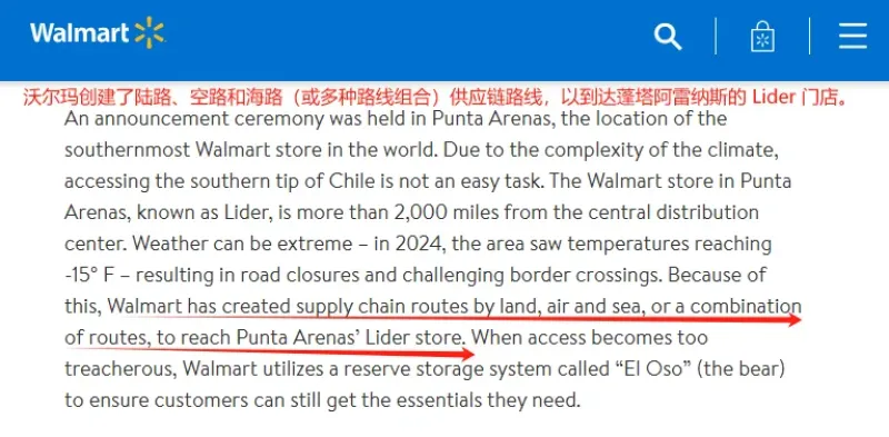 說實(shí)話,沃爾瑪此次擴(kuò)張智利南端地區(qū)并不容易,因?yàn)?/span>蓬塔阿雷納斯地區(qū)距離中央配送中心超過2000英里,還面臨著極端天氣,這給供應(yīng)鏈運(yùn)輸帶來巨大挑戰(zhàn)。對(duì)此,沃爾瑪建立了多條供應(yīng)鏈路線,并使用“EI Oso”的儲(chǔ)備存儲(chǔ)系統(tǒng),以確保滿足消費(fèi)者需求。