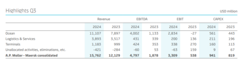 實際上,馬士基今年的表現可以說是相當不錯。據其10月底發布的2024年第三季度財報顯示,在該季度其營收為157.62億美元,同比增長30%;息稅前利潤(EBIT)33.09億美元,同比增長515%。