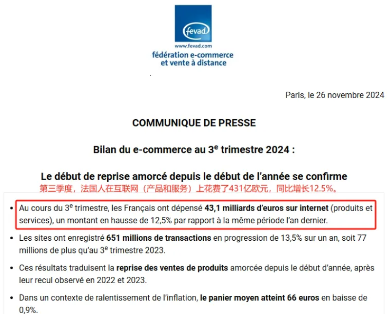 另外,就在上個月底,法國電商和遠程銷售聯合會(Fevad)也發布了一項研究,數據顯示,在今年第三季度,法國人線上支出達到431億歐元,同比增長12.5%,而電商平臺共收獲6.51億筆訂單,同比增長13.5%,比去年同期增加了7700萬筆。?