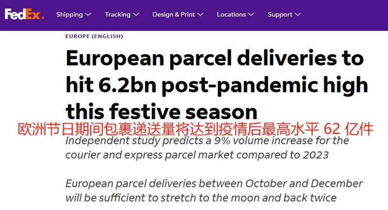 此前,聯邦快遞分析了來自41個國家的300多家承運商的500,000個數據點,之后發布了相關的研究報告,數據顯示,在今年旺季期間(10月-12月),整個歐洲包裹承運商將配送62億件貨物,同比增長9%