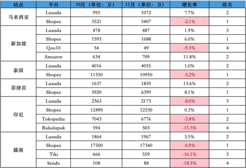 11月東南亞電商平臺(tái)訪問(wèn)量數(shù)據(jù) 圖源:跨境東南亞