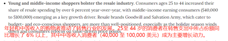 值得注意的是,年輕和中等收入的消費者是美國二手轉售市場的主力軍。數據顯示,25至44歲的消費者的支出在該國二手轉售市場中所占的份額同比增長了 超過6%。與此同時,美國中等收入消費者(年收入4萬至10萬美元)群體是轉售市場支出增長的主要推動力。