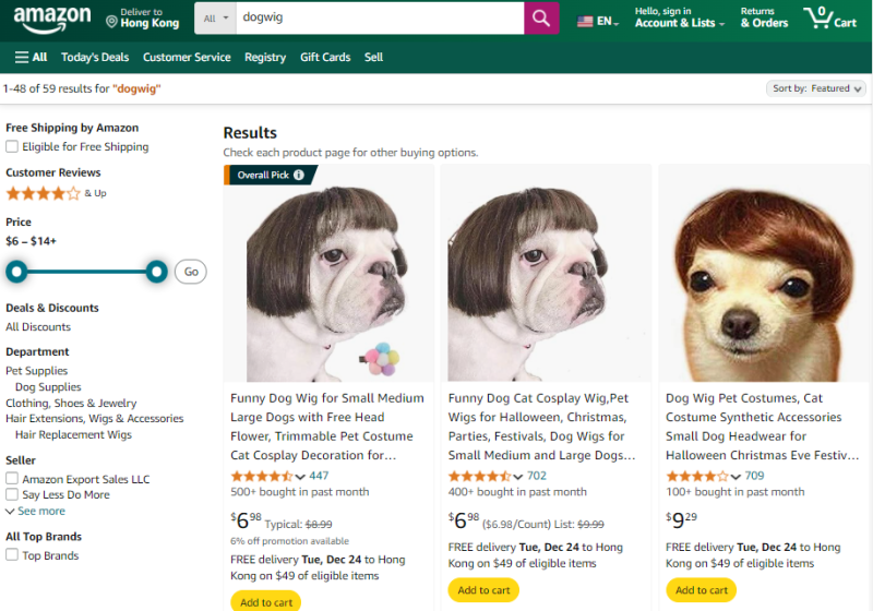 談到假發,基本上大家想到的都是人戴的,事實上現在的假發行業早已經發展到了“Next Level”,人們的愛寵也擁有了發型各異的假發飾品。在TikTok上以“dogwig”(狗狗假發)為關鍵詞搜索,可以看到不少千百萬播放量的熱門視頻。在亞馬遜平臺上,狗狗假發的銷量也十分可觀。更重要的是,這樣一種看起來很小眾的產品,客單價還挺樂觀。