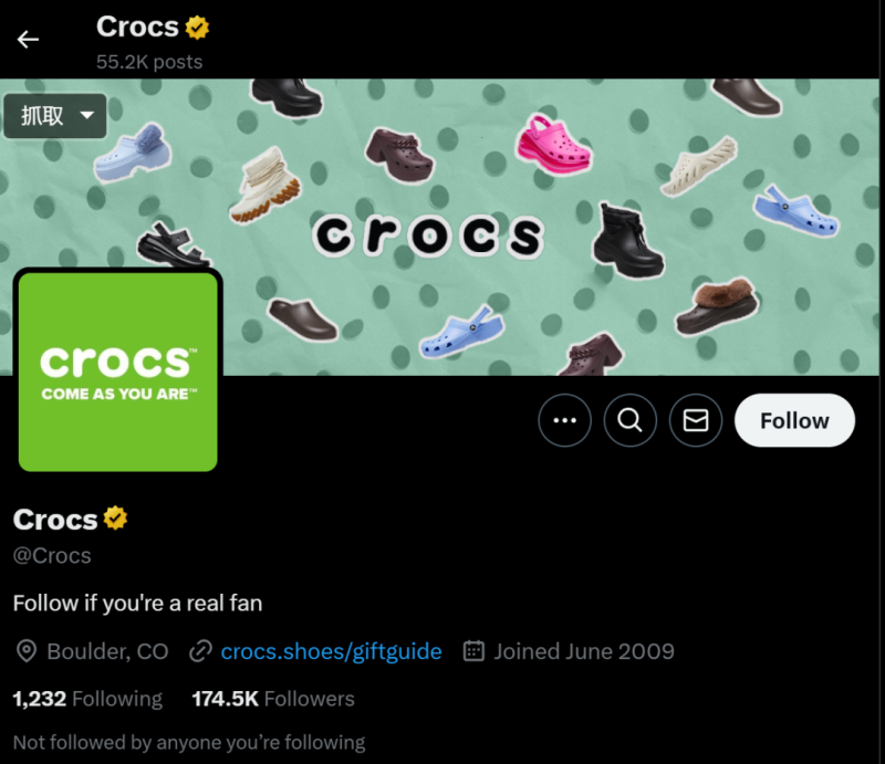 目前來看,Crocs在TikTok、YouTube、X(Twitter)等多個社交媒體平臺都創建了賬號,并且收獲了不少粉絲。例如Crocs在TikTok上的官方賬號粉絲已經突破了250萬,在YouTube上的賬號@crocsinc擁有超2.4萬訂閱者,在X上也積累了超17萬粉絲。