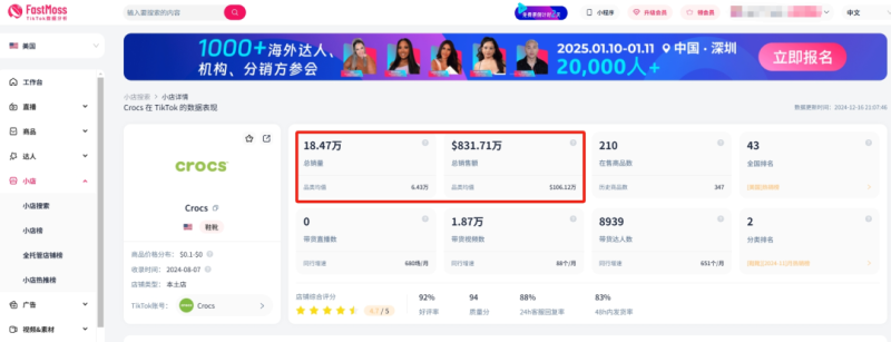 據FastMoss最新數據顯示,截至目前,Crocs在TikTok店鋪總銷量已經達到18.47萬件,總GMV高達831.71萬美元。與此同時,在TikTok平臺上#crocs標簽的播放量已經突破了176億,受到消費者廣泛的關注。