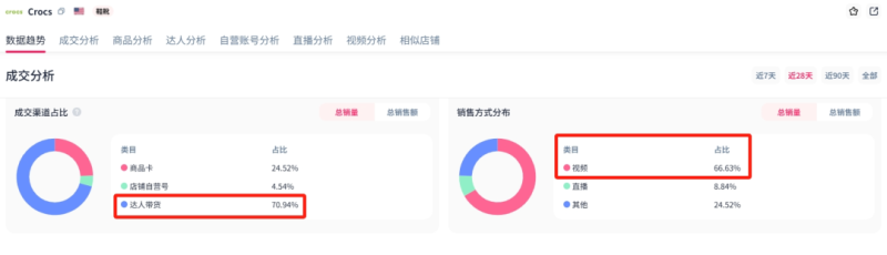 與此同時,通過網絡達人營銷提升產品銷量也是很重要的一環。據FastMoss數據來看,視頻銷售、達人帶貨是Crocs很重要的成交渠道和銷售方式,占比都在一半以上。