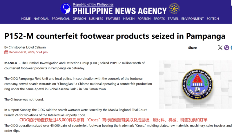 值得一提的是,當品牌影響力上升之后,一些怪象也在同步發生。就在12月初,菲律賓警方逮捕了售假的跨境電商賣家,該賣家所侵權的便是Crocs,這個非法的跨境生意涉案金額達1.52億,當地警方在其倉庫里繳獲的Crocs拖鞋超過了46000雙。