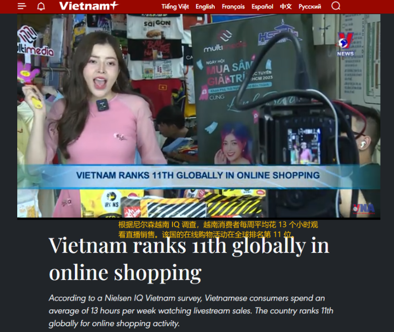 根據(jù)Nielsen IQ Vietnam的一項(xiàng)調(diào)查,越南消費(fèi)者每周平均花費(fèi)多達(dá)13個(gè)小時(shí)觀看直播銷售,這推動(dòng)越南電商市場(chǎng)快速發(fā)展,目前越南消費(fèi)者網(wǎng)上購物排名躋身全球第11位。