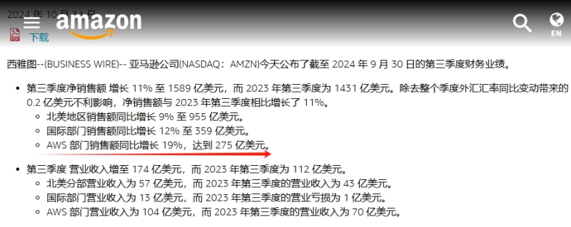 客觀來(lái)講,AWS選擇擴(kuò)展市場(chǎng)的時(shí)間點(diǎn)也十分合適,據(jù)其此前公布的第三季度業(yè)績(jī)報(bào)告來(lái)看,也有著強(qiáng)勁的增長(zhǎng)趨勢(shì)。詳細(xì)來(lái)看,第三季度凈銷售額增長(zhǎng)了11%至1589億美元,其中AWS銷售額同比增長(zhǎng)19%,達(dá)到275億美元。