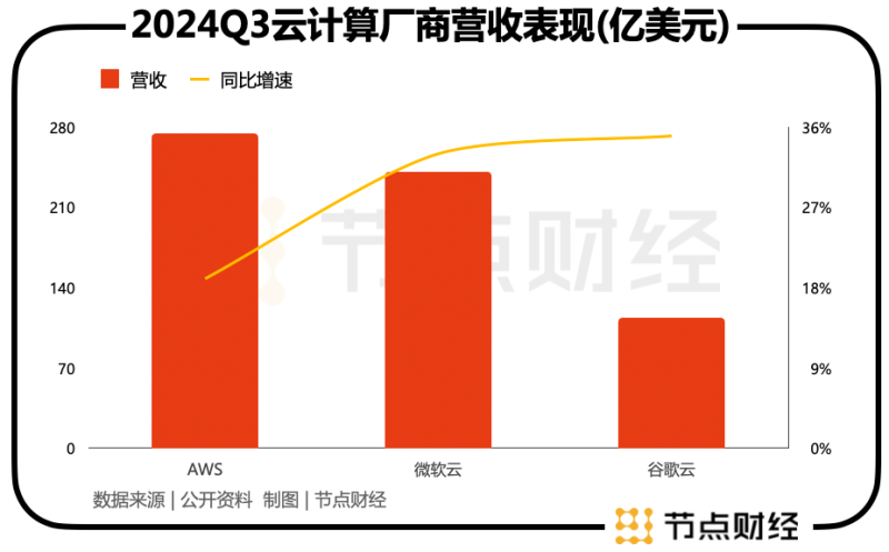 從營(yíng)收上來(lái)看,目前的云計(jì)算市場(chǎng)依舊是AWS、谷歌云、微軟云“三足鼎立”的狀態(tài),AWS處于領(lǐng)先地位,但與微軟云的差距并不算大。而且從增長(zhǎng)速度來(lái)看,AWS也不占優(yōu)勢(shì):在2024年第三季度,AWS營(yíng)收為274.52億美元,同比增長(zhǎng)19%,同一階段的微軟云、谷歌云增速分別為33%、35%。