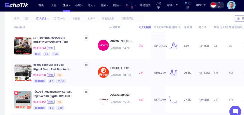 根據EchoTik的數據,TikTok印尼本土店“ADVAN INDONESIA”旗下的一款機頂盒產品近7天售出908臺,總銷量達到8000件,攬下10億印尼盾GMV(約6萬美金),成為TikTok印尼單周銷量最高的機頂盒產品。銷量榜排名第二的仍是一家印尼本土店——“FINITO ELEKTRONIK”,近7天售出734臺。