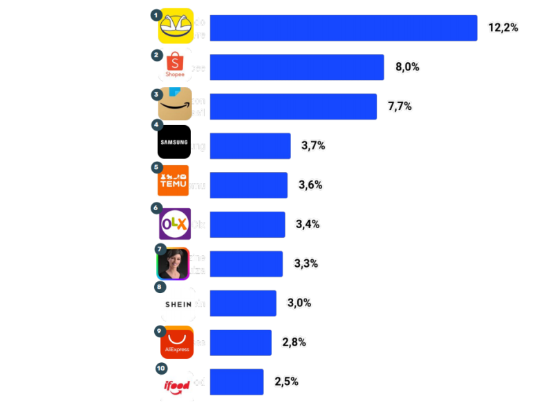 12月19日消息,研究機構Conversion最新報告顯示,今年11月,TEMU巴西點擊量超1.07億次,市場份額達3.6%。自今年5月進入巴西市場以來,短短半年,TEMU超越Olx、SHEIN、速賣通和Maganize Luiza,迅速成長為巴西第五大電商平臺,前四名為美客多(12.2%)、Shopee(8%)、亞馬遜(7.7%)和三星(3.7%),SHEIN和速賣通分別排名第八和第九。前十大電商平臺合計占據了巴西電商市場50.2%的份額。