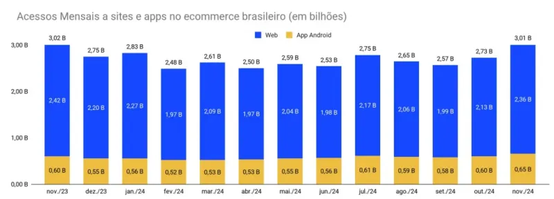 從流量變化趨勢分析,11月巴西電商訪問量較10月增長10.5%,網頁訪問量增長11%,應用程序訪問量增長8.8%,市場呈現出蓬勃向上的發展態勢。流量來源方面,移動端訪問已占據巴西電商市場的主導地位。過去12個月中(截至11月),巴西電商網站和應用程序的總點擊量達到320億次,移動端占比高達76%,具有顯著優勢。進一步細分中,手機流量占比54.8%,桌面流量占比23.5%,應用程序流量則占21.7%。不同品類在移動端和應用程序訪問占比上存在明顯差異。