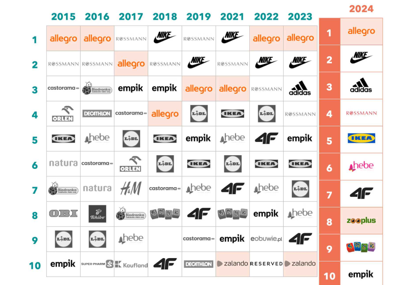 近日,OC&C Strategy Consultants Polska根據2500名波蘭消費者的評價,發布了一項最新的調查,數據顯示,Allegro和Nike已經連續第3年位列波蘭最受歡迎零售品牌前兩名。
