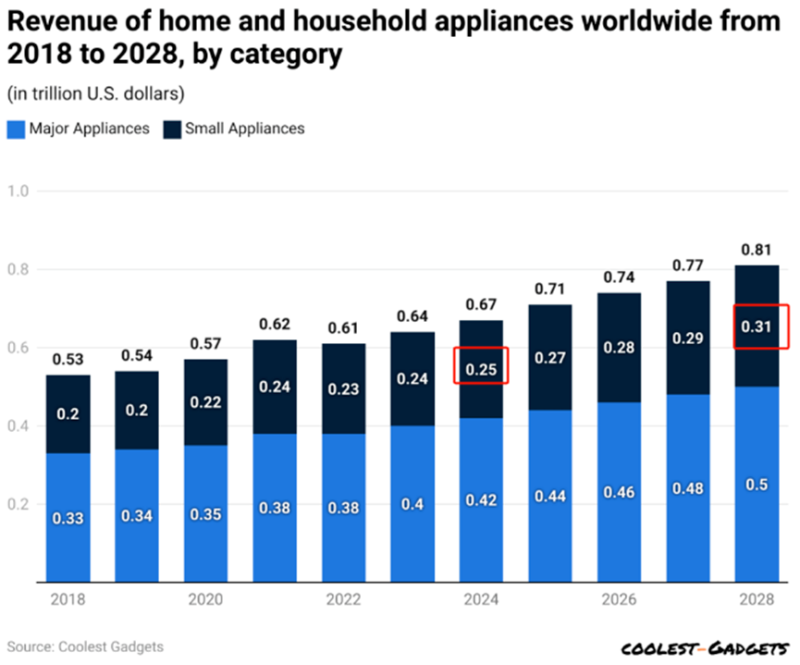 數據顯示,2024年全球小家電市場規模將達到2543億美元,預計到2028年,市場將保持4.65%的年復合增長率,達到3100億美元。廚房小家電如空氣炸鍋、酸奶機等,占據了市場的半壁江山,市場規模將達到1336億美元。