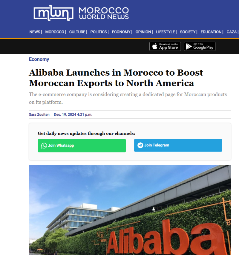 據了解,該消息是阿里巴巴于12月18日在卡薩布蘭卡與摩洛哥出口商聯合會(ASMEX)和摩洛哥投資與出口發展局(AMDIE)共同舉辦的活動上宣布的。