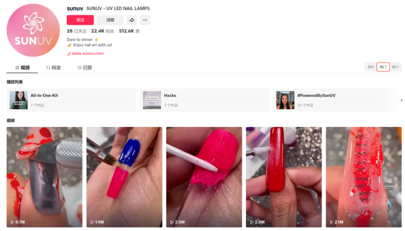 這與SUNUV的精心業務布局策略密切相關。在營銷策略上,SUNUV建立起了一套“線上+線下”雙頭聯通的銷售網絡。在線上,SUNUV入駐了亞馬遜、速賣通、eBay等跨境電商平臺,并開通了品牌獨立站。此外,SUNUV還在TikTok等社交媒體平臺上抓住了流量紅利,通過發布美甲DIY教程、產品使用方法以及折扣信息等內容,吸引了大量用戶關注。