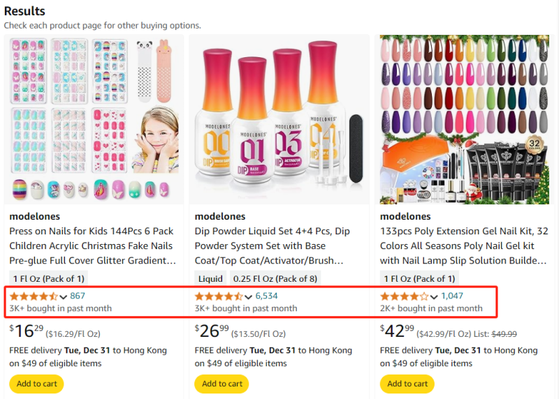 除了前文提到的SUNUV,主攻歐美市場的中國品牌Modelones通過提供指甲粉、指甲油、指甲凝膠和美甲工具等多樣化產品,成功打響了海外招牌。據了解,Modelones的年營收保持在200萬至500萬美元之間,其產品在亞馬遜等跨境電商平臺上銷量火爆,部分單品月銷超過2000件,留評數超過6000條,成為了美甲類目出海的一大典范。