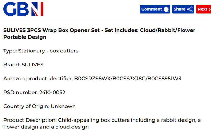 第二款產品是SULIVES品牌的3件套包裝盒開箱器套裝,包括云朵、兔子、花朵三種圖案。至于這款產品被召回的原因,OPSS指出,這些小刀存在割傷風險,可能會導致幼童在無人看管的情況下使用被割傷。并且,該產品還不符合2005年通用產品安全法規(guī)的要求。