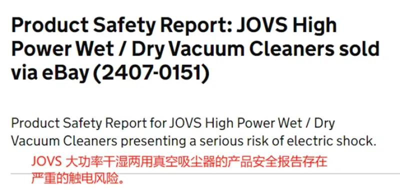 JOVS吸塵器存在觸電風險 圖源:gov.uk