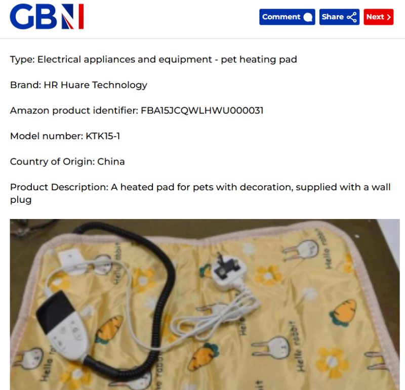 由于這款產品不符合2016年電氣設備(安全)條例的要求,目前產品已在邊境被拒絕進口,亞馬遜則采取了相應的召回措施。